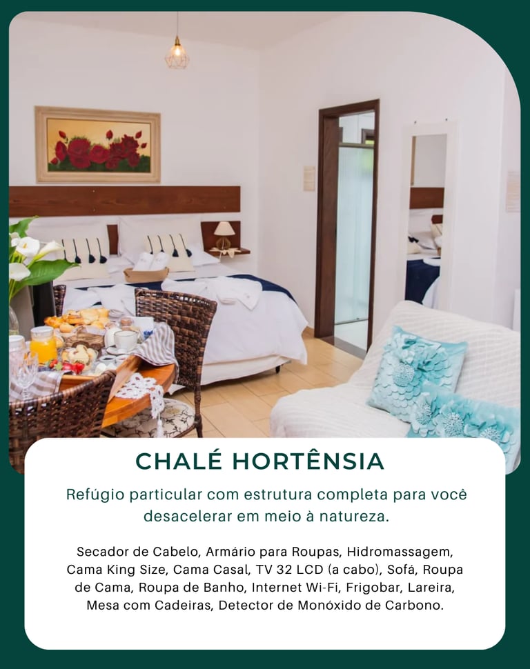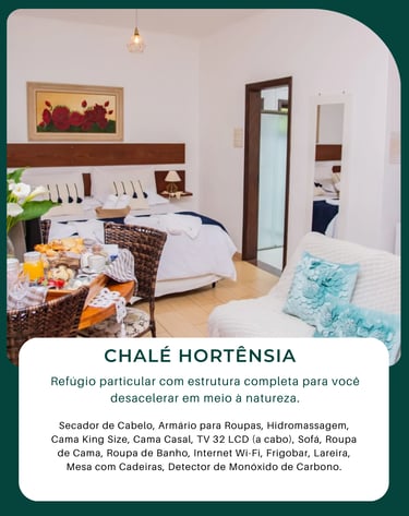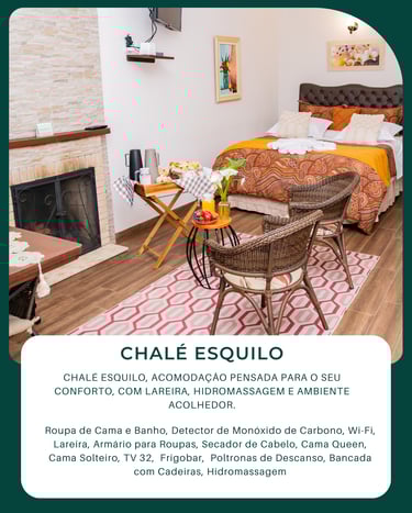 Cada chalé foi pensado para garantir privacidade, conforto e momentos de descanso verdadeiro. Com lareira, banheira de hidromassagem e café da manhã servido diretamente na acomodação, criamos um ambiente ideal para quem deseja desacelerar e aproveitar o clima serrano com tranquilidade.
