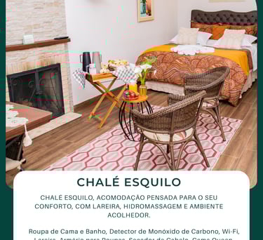 Cada chalé foi pensado para garantir privacidade, conforto e momentos de descanso verdadeiro. Com lareira, banheira de hidromassagem e café da manhã servido diretamente na acomodação, criamos um ambiente ideal para quem deseja desacelerar e aproveitar o clima serrano com tranquilidade.